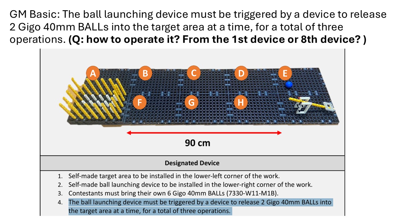 GM Basic: The ball launching device must be triggered by a device to release 2 Gigo 40mm BALLs into the target area at a time, for a total of three operations. (Q: how to operate it? From the 1st device or 8th device? )