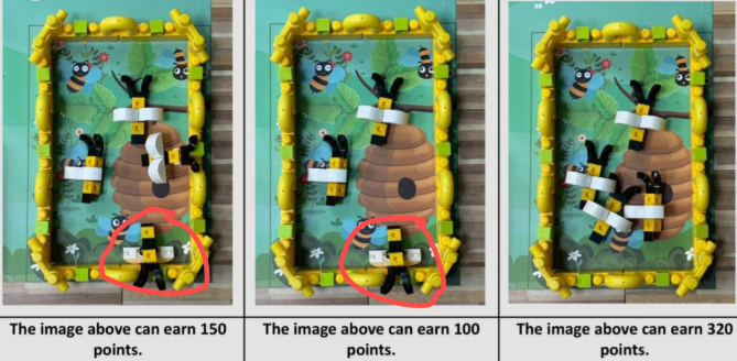 哪一隻蜜蜂沒有分數? 是我圈起來的那個嗎?意思是只有蜂巢裡面的蜜蜂才會得分,對吧?如果只碰到蜂巢,還有一部分在蜂巢外面,就不會得分,對吧?暫放區的小蜜蜂運送到小蜜蜂蜂巢區,每個50分,若完成4個,小計積分200分,額外加分120分,總分320分(競賽結束前蜂巢需壓到綠框任一地方方可計算分數,若競賽結束前蜂巢未壓到綠框任一地方除不計分外,將計算一次破壞場地)。