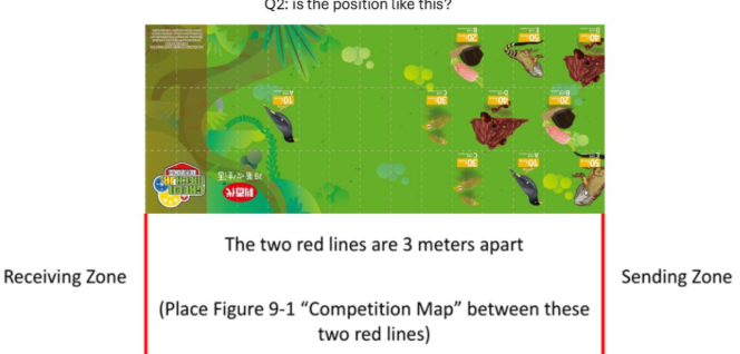 簡章中這兩個是分別示意,比賽時,賽道圖擺在發送區及接收區中央,僅為了明確讓各賽道的兩區之前長度相同,不特別定義哪一個圖案在哪一邊。